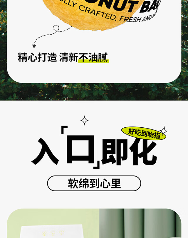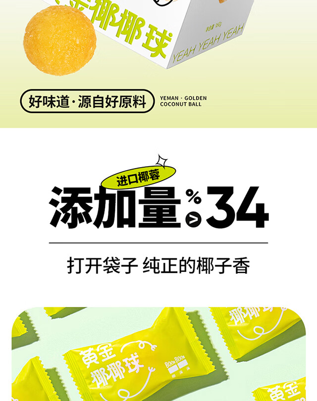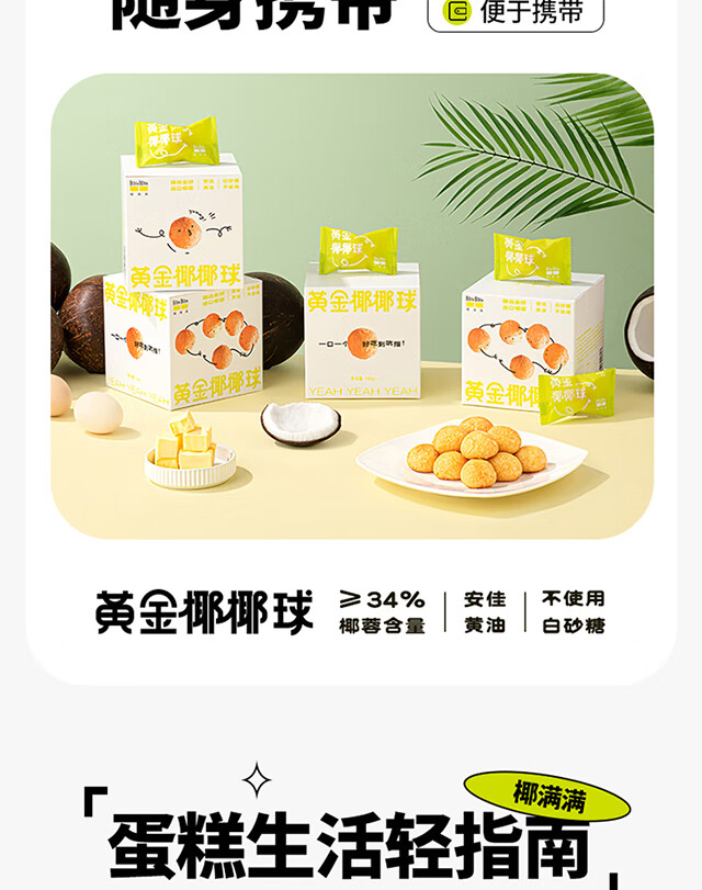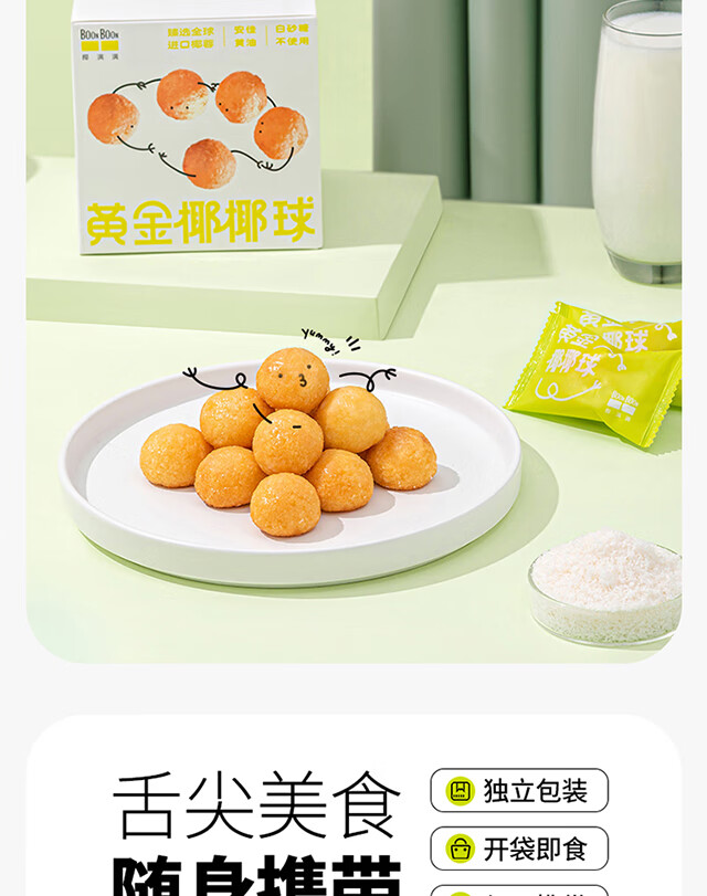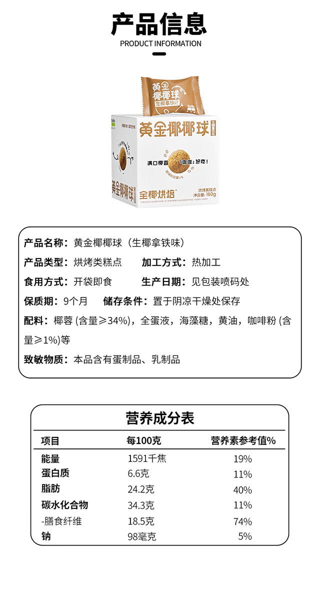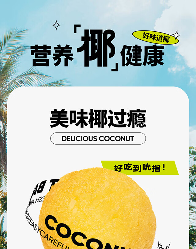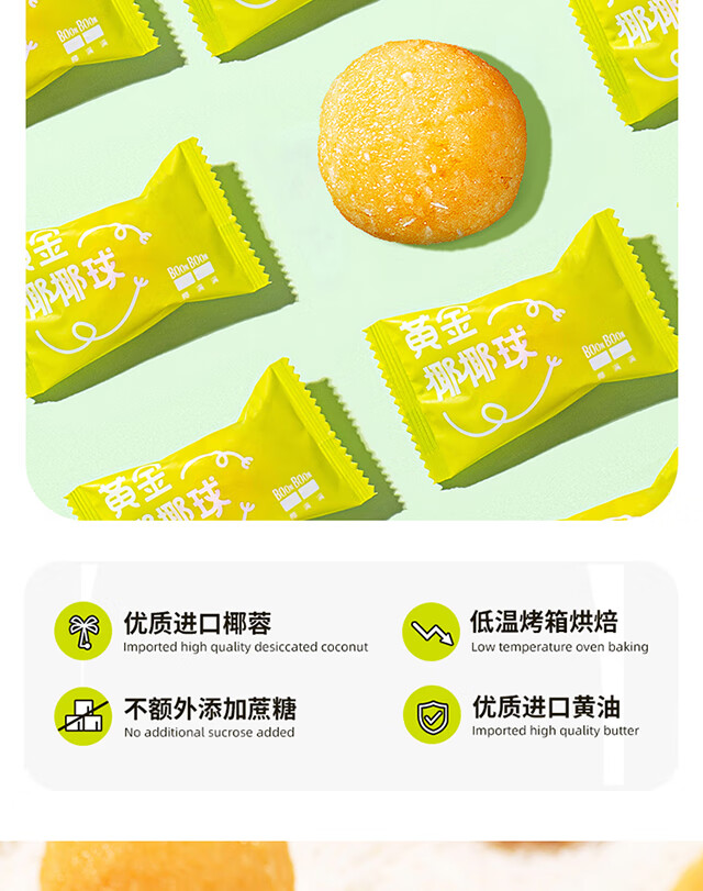 1、健康配方:斯里蘭卡進(jìn)口椰蓉,添加量大于等于34%,新西蘭進(jìn)口安佳黃油,海藻糖代替白砂糖,優(yōu)質(zhì)原料,食用放心又健康 2、無麩質(zhì)全椰烘焙,小體積大能量,高膳食纖維的椰蓉制作,抗餓飽腹 3、獨(dú)立小包裝,開袋即食,便于攜帶分享 4、口感綿密,嚼得到椰蓉,好吃到吮指,一口一個(gè)黃金椰絲球 5、生椰拿鐵味加入雀巢咖啡粉,煥新風(fēng)味,和咖啡/牛奶更配哦