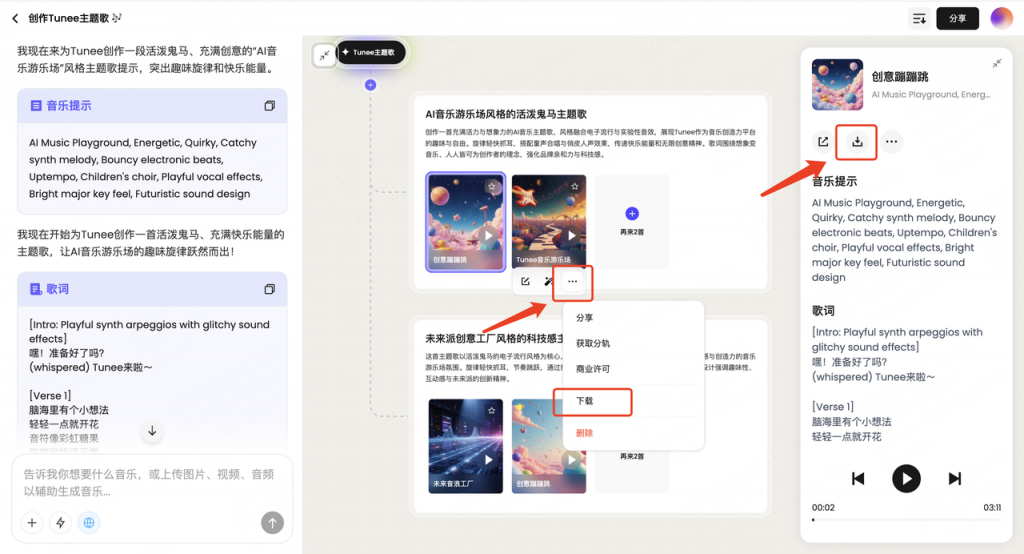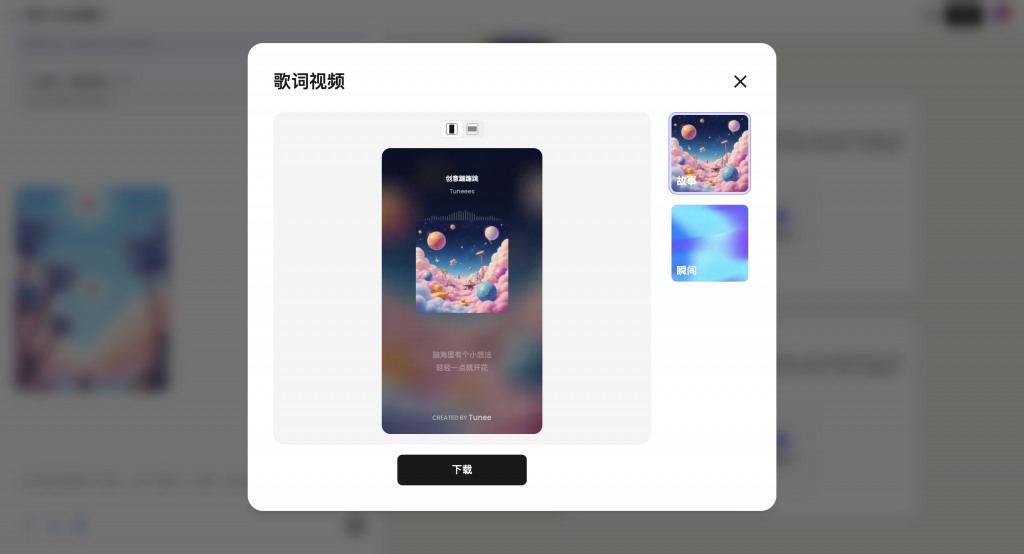 音樂生成后,即可一鍵下載全曲歌詞視頻,快速分享也酷炫。