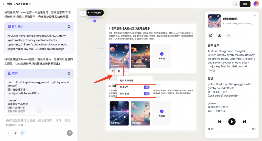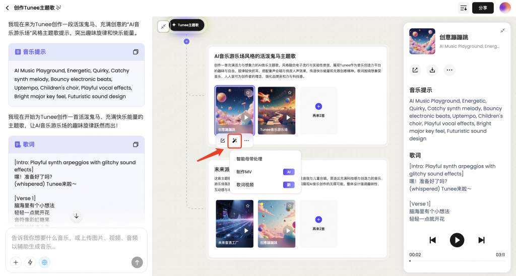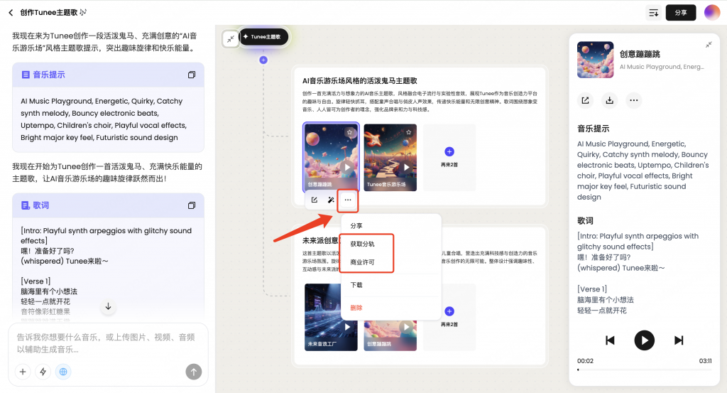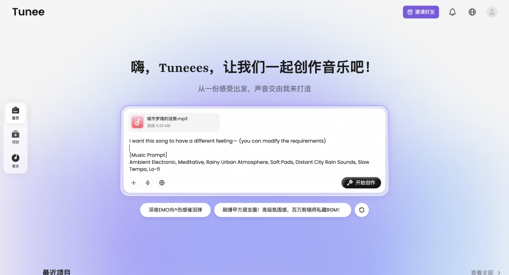 告別復雜的prompt,聊聊天就能寫出好歌。僅需用自然語言描述想法,Tunee將通過會話理解你的需求、推薦最匹配的音樂方案,甚至可以為你的音樂作品提供建議。