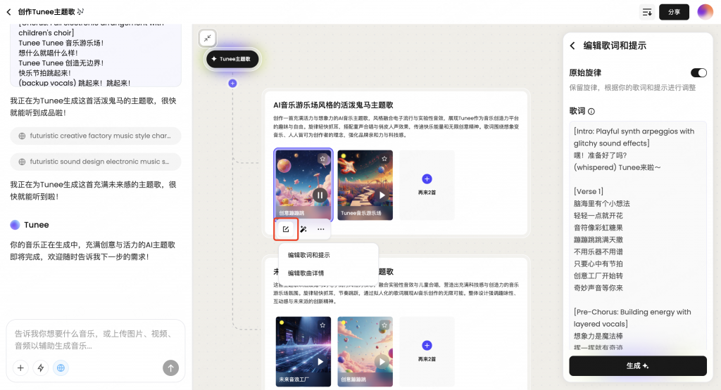 支持歌詞修改與提示詞調整(可選擇保留原旋律或重新編曲)