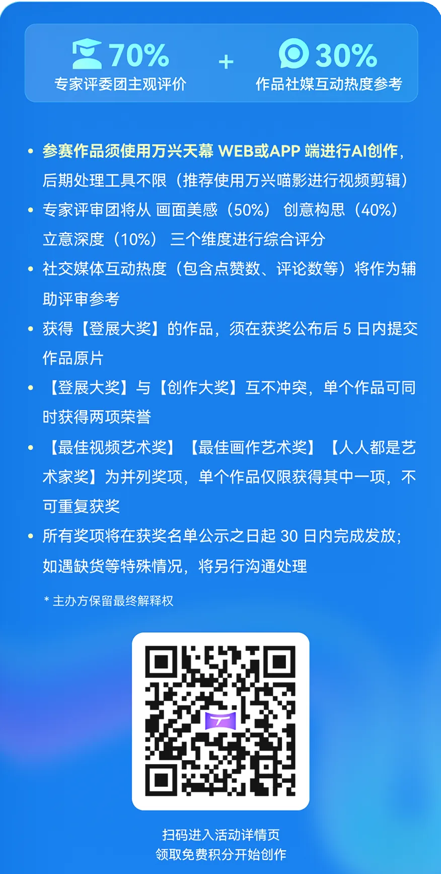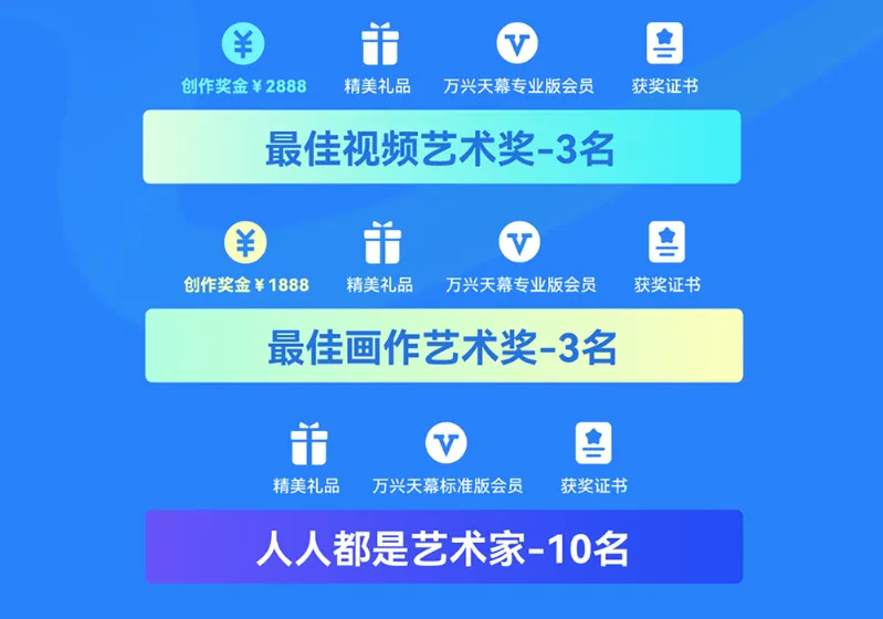 須使用萬興天幕 WEB或APP端TOMOVIEE.CN進(jìn)行AI創(chuàng)作,并將作品發(fā)布在幻未來官網(wǎng)FUTURE-FANTASY.COM、B站、微博、小紅書、視頻號、抖音、快手任一社媒平臺,附帶以下話題#萬興天幕帶你登展大藝博 #天幕AI #幻未來 (缺一不可)